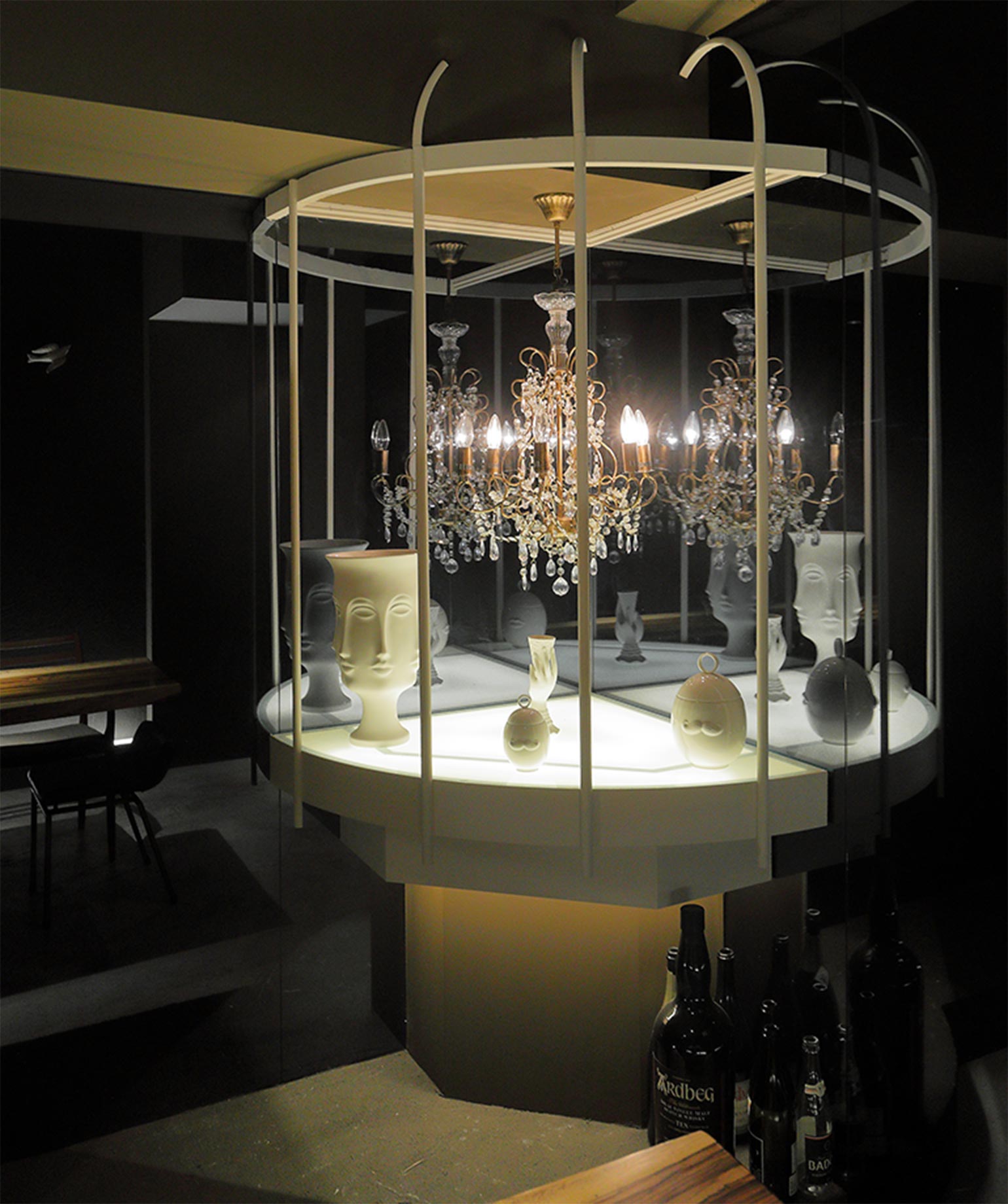完全予約制のハイセンスな個室のあるワインバー。店内の至るところで、フランスを彷彿とさせる、アンティークな大小様々の鳥かごのモチーフが見受けられます。特に大きな鳥かごを模したエントランスは、そこを抜けて入ることで「都会の喧騒から解き放たれて楽しんでほしい」という意味を込めています。不規則な形や模様が見られるゼブラウッドの無垢板は、この世界観にグッと引き込みます。