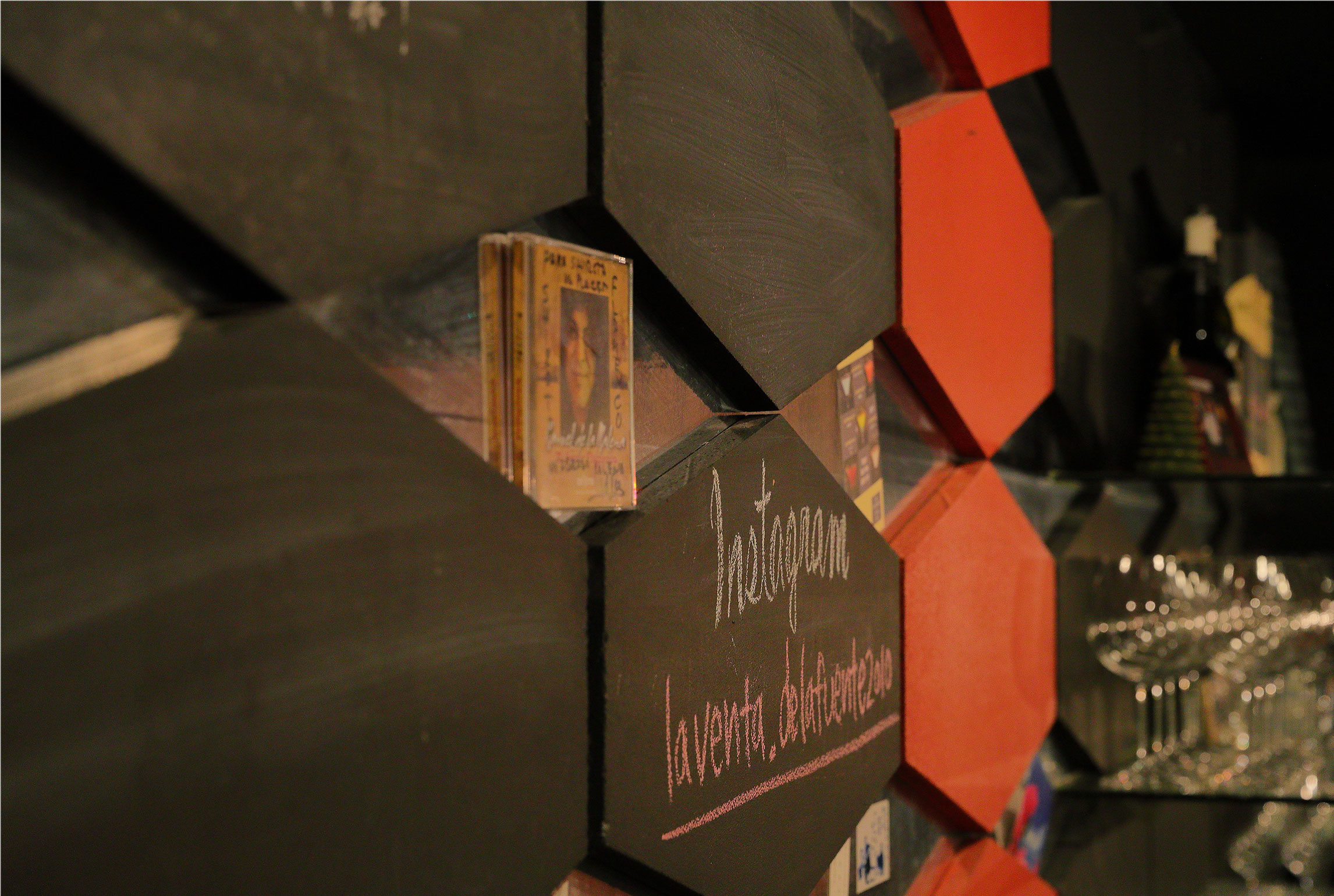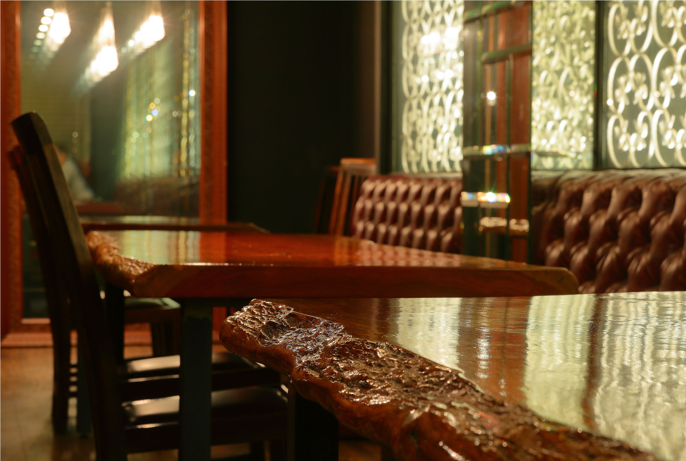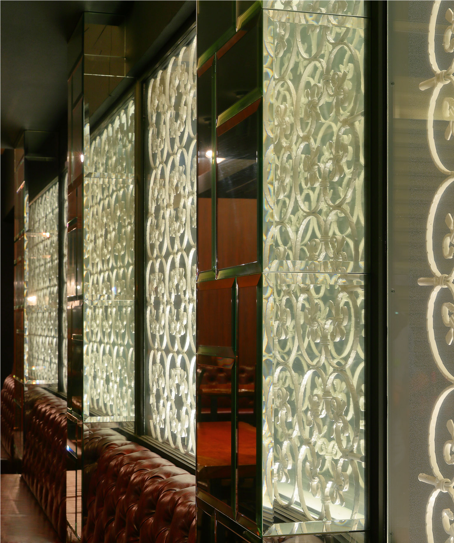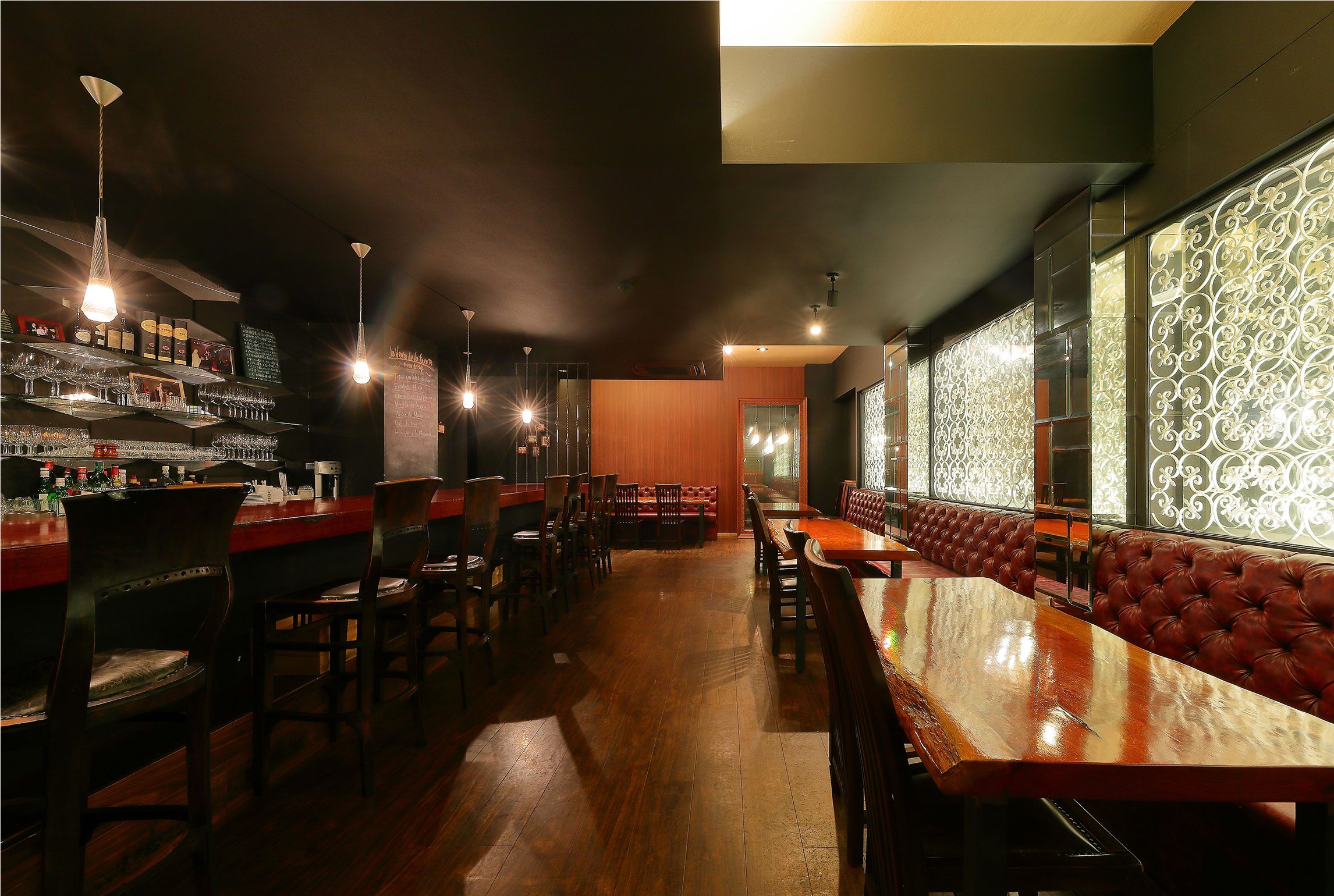 スペイン南部のアンダルシア地方をイメージしたスペインバル。ファサードのサインは、フランメンコのようなラテン気質を店内に入る前から印象付けます。店内でまず目に飛び込むソファーバックのロートアイアンとミラーは、幻想的な輝きを生み出しています。複層ガラスの映り込みを活かしたコルトンボックスは、ロウソクのような灯りで、アンティークな雰囲気を醸し出します。赤と黒のカウンターバックは、スペインらしい色使いで全体を引き締めています。
