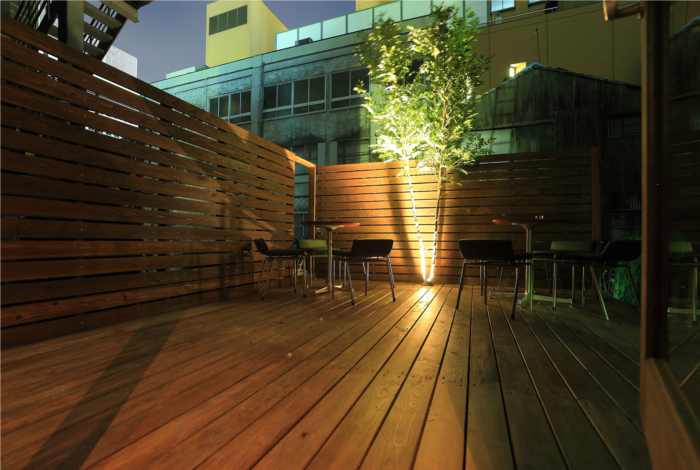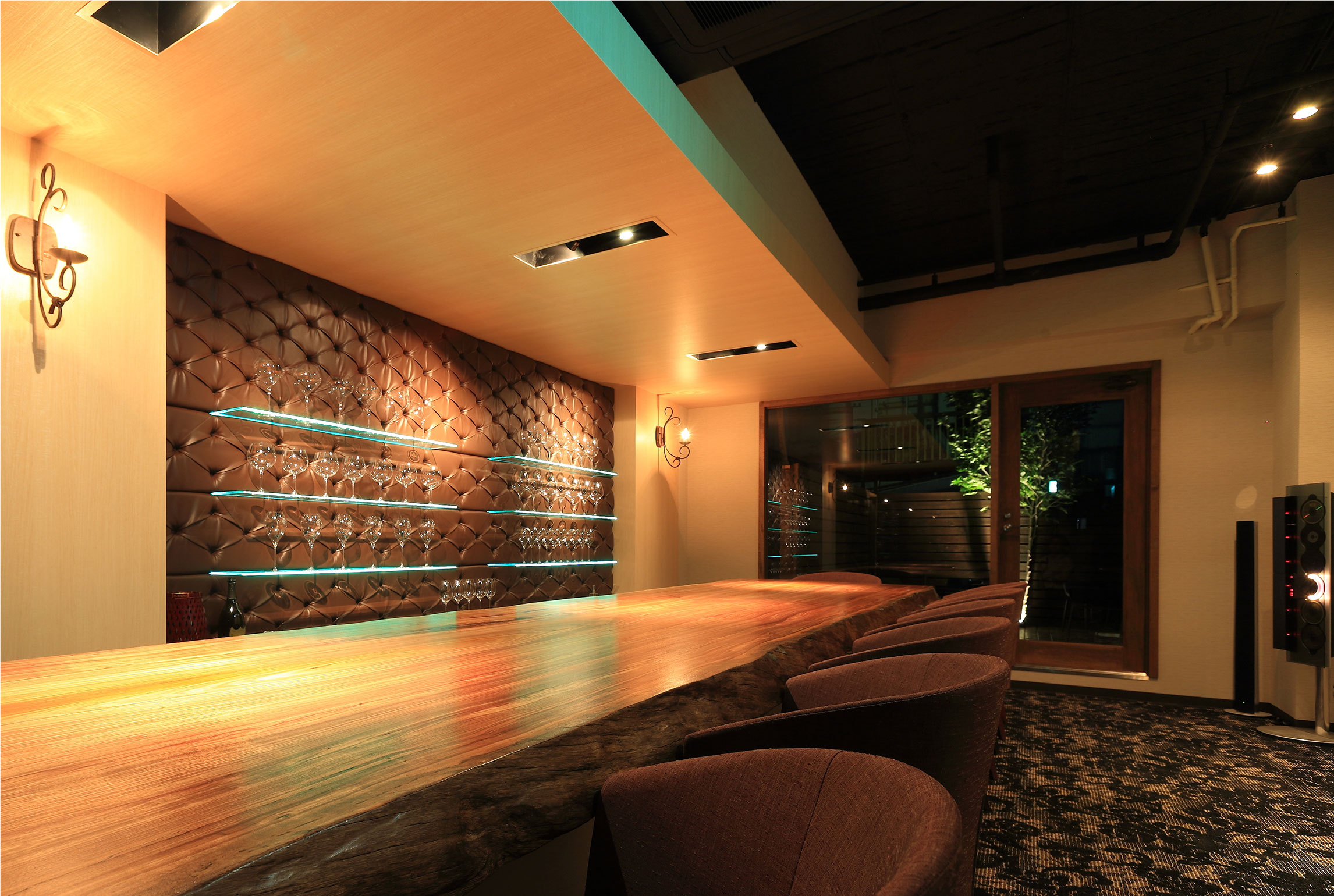 落ち着いたシックな大人の雰囲気が漂うレストランバー。1階のバー部分では、カウンターの長さ5m、奥行き1m20cmのベリの一枚板が、高級感を引き立てています。バルコニー部分もシックな雰囲気に合う、モダンなウッドデッキに改装しました。