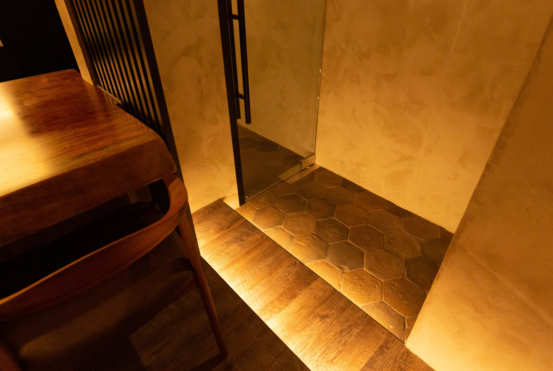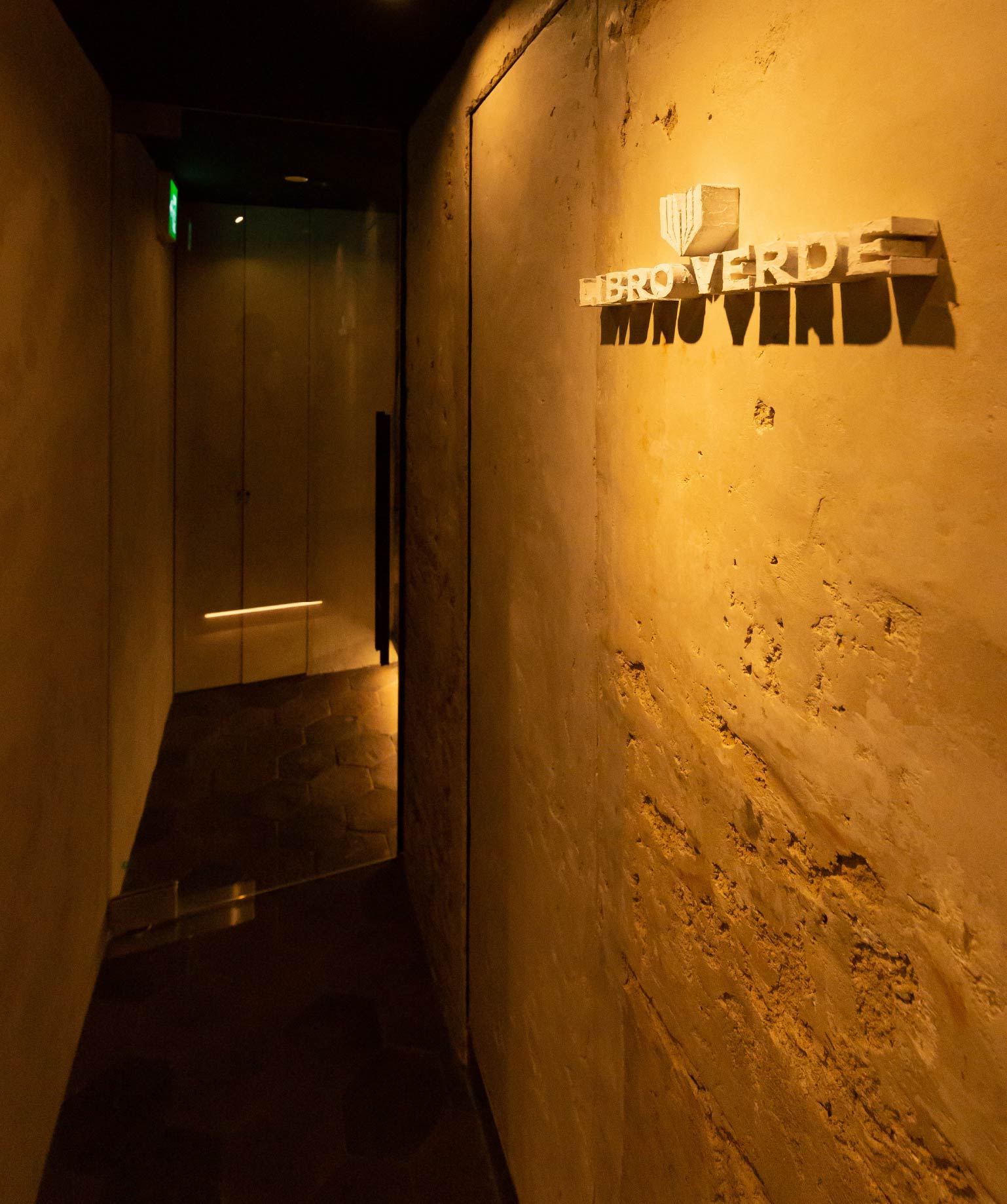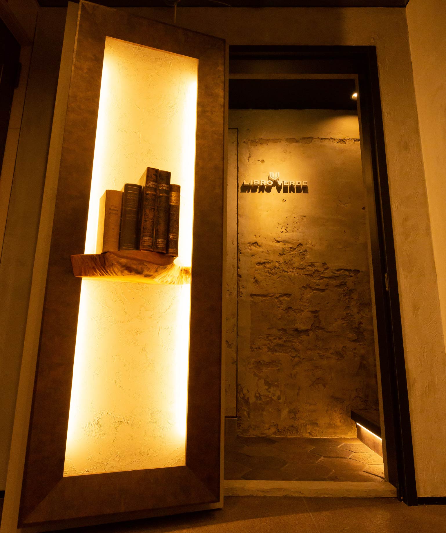 素材と技法をいかした、創作料理店 デザインコンセプトは、モノクローム 店内は、10坪と広くはないスペースだがカウンター8席のラグジュアリーを演出。 アイキャッチは、屋号のLIBRO VERDE (スペイン語で緑の本)をスペインの古書でエントランスドアの裏側にオブジェとして設えた。