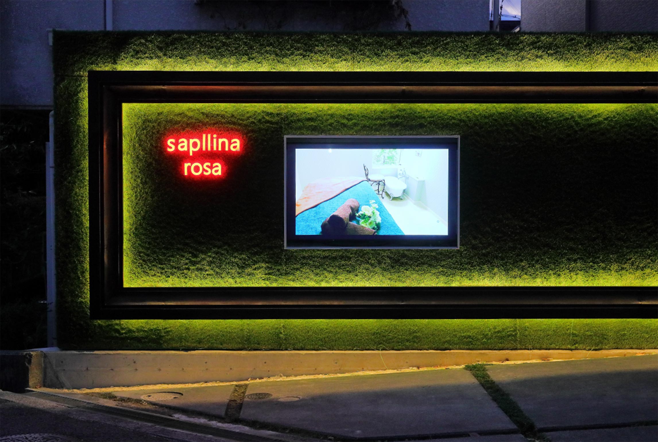 郊外住宅地にあるエステサロンの屋外大型デジタルサイネージ。8m×3mという非常に大きな外部看板ながら、住宅密集地にも溶け込み、違和感のないシンボリックなランドマークとしての役割にもなっています。60インチのTVモニターでは、新しいエステやその他のPRを流し、集客効果も期待できるデザインに仕上げました。